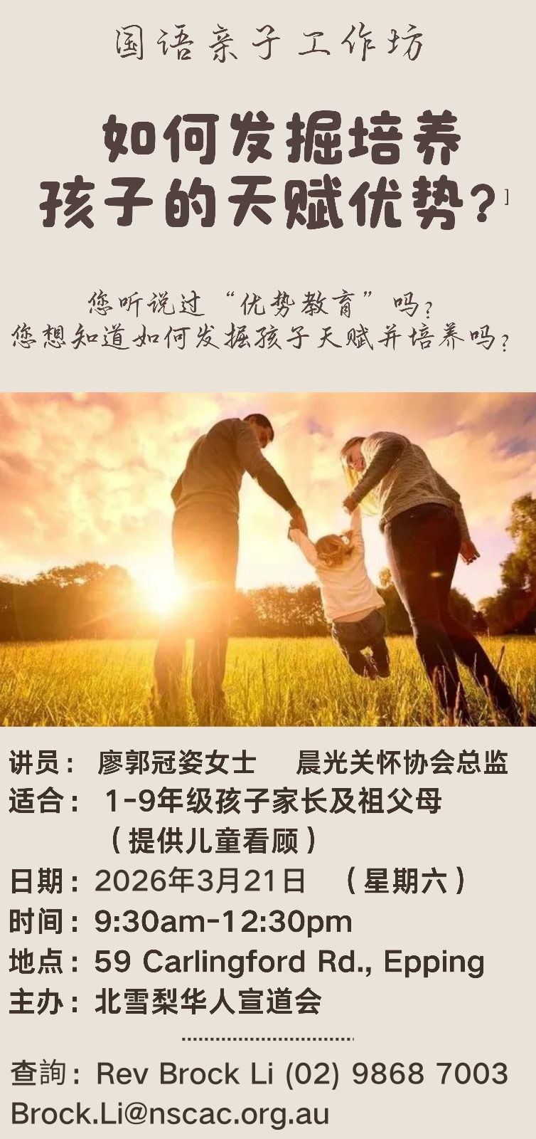 高情商亲子互动工作坊:化“危”为“机”的挫折学习 每一位父母都是孩子天生的导师,尤其是面对错误、问题和挫折时,我们的方式和态度,对孩子都有着决定其人格的深远影响。 当“一切顺利”成为我们栽培孩子成长过程的最高目标时,我们可能因此忽略了面对生活中的挫折、困难、冲突和矛盾,正是让孩子思考“我是谁”“世界是怎样的” “我与他人是怎样的关系”这一系列人生命题的重要契机。 化“危”为“机”的面对挫折的学习,视错误和挫折为成长的良机,将通过游戏活动帮助亲子辨别生活中不易觉察的“刻板思维”和“惯性语言”,以成长性的思维和的言语来破解障碍,化“危”为“机”,帮助亲子收获更具韧性的生命成长。 欢迎家有6-15岁的父母们携童一起参与这有趣又有益的亲子工作坊。 讲师:宋晓玲 Joy Song - 悉尼晨光关怀协会家庭教育高级主任 - 新加坡国立大学社会工作硕士时间:2025年12月6日(周六) 晚上8:00 - 9:30形式:Google Meet费用:每个家庭 $30*# * 可通过银行转帐或到晨光网页以信用卡付款# 请注意研讨会费用不予退还 報名:https://forms.gle/3oGPH2mmeVo3RNvX6