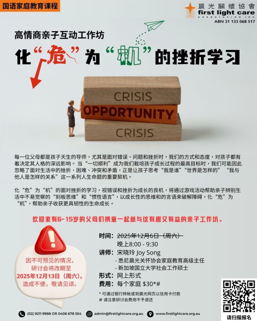 Upcoming Seminars Cantonese Seminars There are no upcoming Cantonese Seminars. Mandarin Seminars 2025-12-13 High EQ Parent-Child Interactive Workshop: Turning Setbacks into Opportunities (Mandarin) 2026-02-28 High EQ Parent-Child Interactive Workshop: Developing Empathy in Parent-child Relationships (Mandarin) 2026-03-14 High EQ Parent-Child Interactive Workshop: Transforming Parent-child Conflict into Personal Growth (Mandarin) 2026-03-21 Mandarin Parent-Child Workshop – How to Discover and Nurture Your Child’s Talents and Strengths (Mandarin)